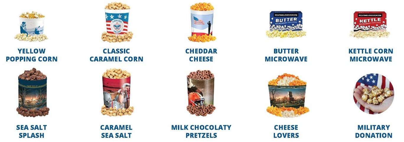 There is supply of extra order forms in a front/back format, with products displayed on one side, and ordering lines on the other. Contact Jim Mason for forms. This 2-page version is also available as a PDF download from the council popcorn webpage [HERE].