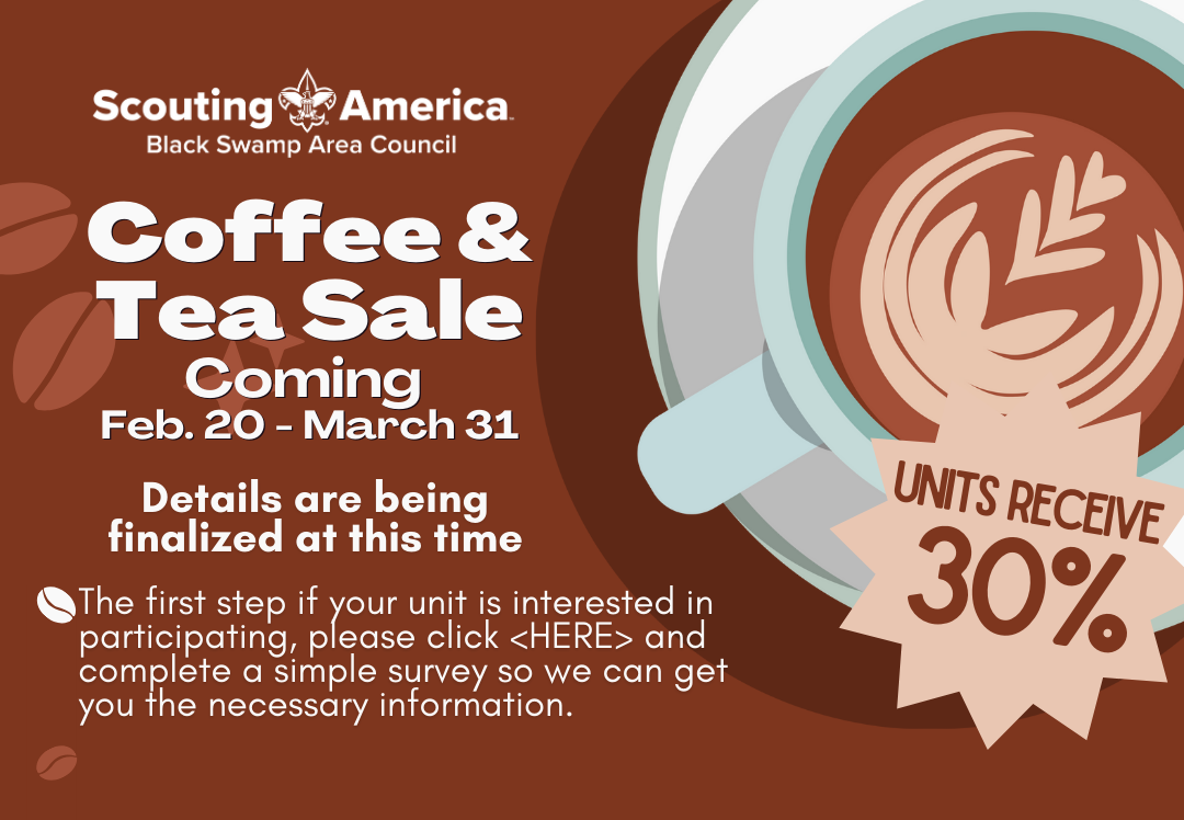 There is nothing better than sipping a premier hot cup of coffee or tea. That is why we are excited about selling ground coffee and tea options for our 2026 Coffee & Tea Sale! This fundraiser aids Scouts in raising funds helping with summer camp and activities for the coming year!