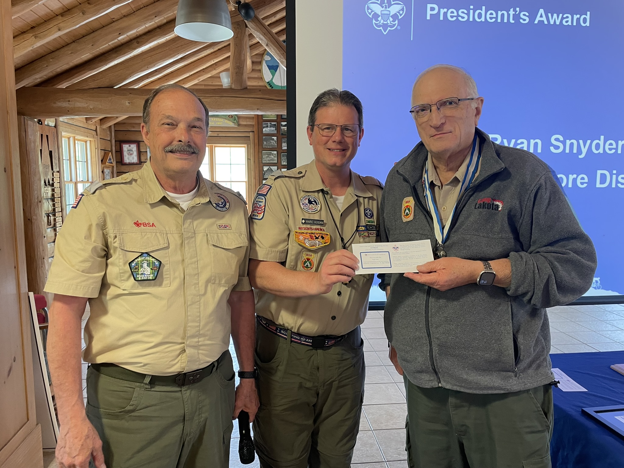 1. Roger Frese – 70?Year Veteran Pin with council president Dave Thompson, Scout Executive Marc Kogan and Riger Freese (left to right)