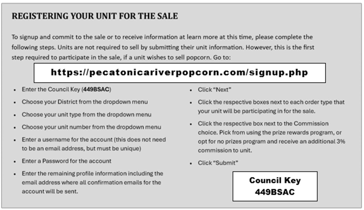 A: yes, please go to the council popcorn page [click here] and on the home page in the gray box is “Informational Sign-up” to register. Please note the Council Key is 449BSAC.